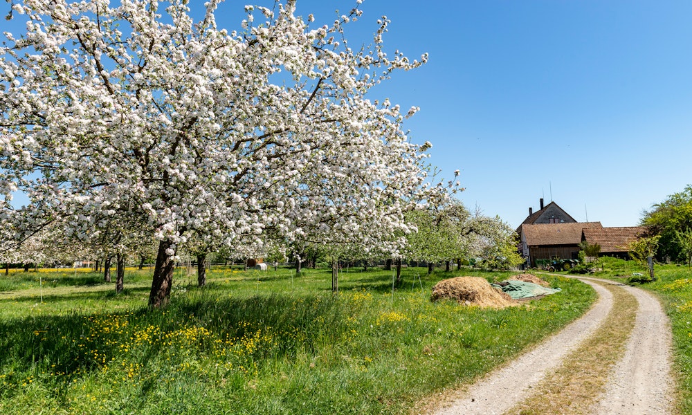 Viele Bäume heisst viele Blüten – und einen prächtigen Blütenzauber, jedes Jahr aufs Neue. Den kann man ab Mitte April besonders in der Bodenseeregion bewundern, wenn sich die Knospen von Apfel-, Kirsch- und Birnbäumen in ihrer ganzen Schönheit entfalten. Allerdings hält sich die Natur nur ungern an fixe Terminpläne. Darum gibt’s im Thurgau eine offizielle «Madame Bluescht», die man über die Telefonnummer 071 531 01 30 erreichen kann. Dieses Profi-Blütenmädchen weiss nicht nur, wo was blüht, sondern gibt auch Insidertipps zu Wanderungen und Veloausflügen. So können auch Sie bald Ihre persönliche Apfel-Tour starten: ganz bequem, direkt vor Ihrer neuen Haustür.