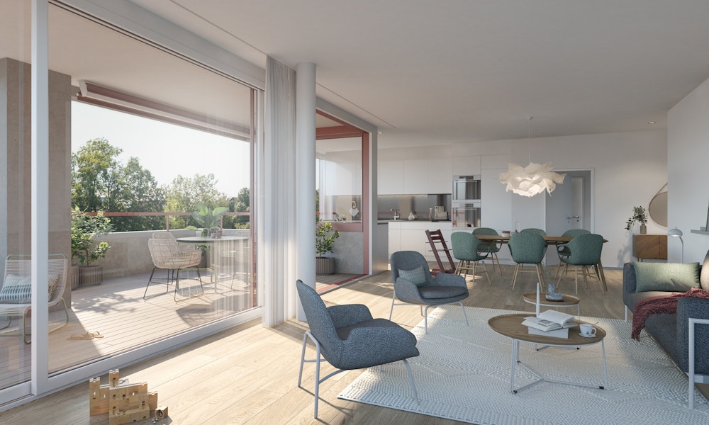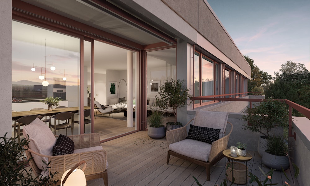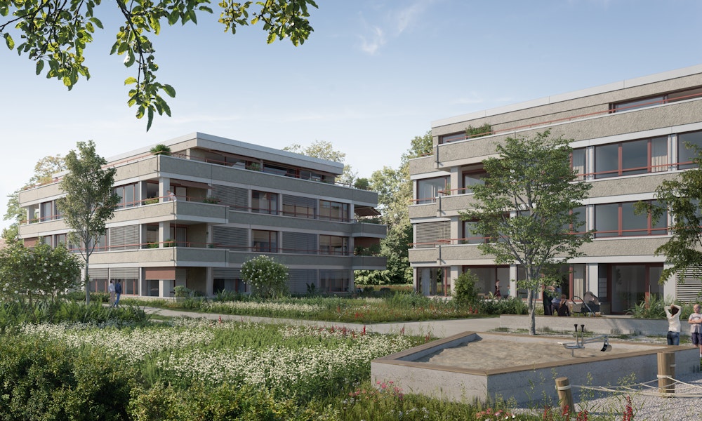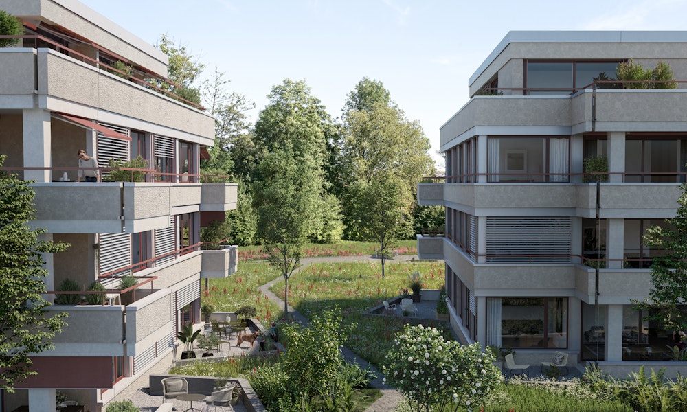 Die Gebäude reihen sich leicht versetzt aneinander und lassen dabei die grosszügige, nach Südwesten orientierte Gartenanlage vor der Waldkulisse wirken. Die Wohnungen orientieren sich um ein zentrales Treppenhaus, was den Häusern rundum ein attraktives Aussehen verleiht. Umlaufende Brüstungsbänder erden die Häuser und verschaffen ihnen optischen Halt. Die allesamt grosszügigen Balkone und Terrassen wirken wie eine zusätzliche Wohnfläche, wo weit mehr als bloss die Sonne genossen werden kann.