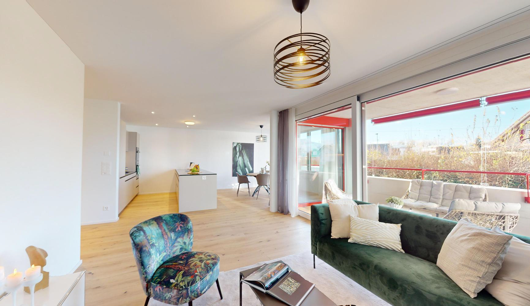 Sie können sich hier in einer 2.5-Zimmer-Wohnung umsehen. Klicken Sie auf die runden Elemente, um sich durch die Wohnung zu bewegen. Mit festgehaltener Maus können Sie das Bild drehen und mit der Rollkugel zoomen. Die Wohnung wurde von uns zur Inspiration möbliert. Sie können den Rundgang auch bildschirmfüllend darstellen. Klicken Sie dafür auf das viereckige Symbol unten in der Leiste.